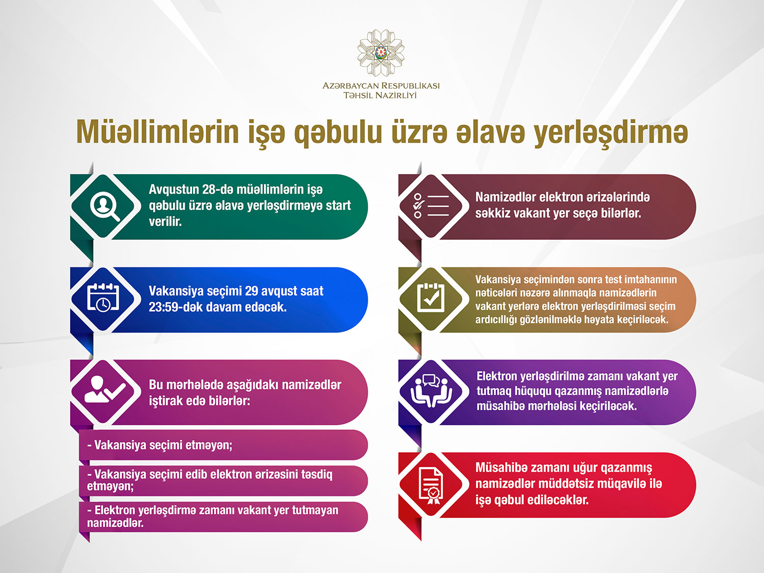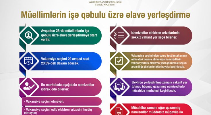 Vakansiya seçimi başa çatdıqdan sonra test imtahanının nəticələri nəzərə alınmaqla namizədlərin vakant yerlərə elektron yerləşdirilməsi seçim ardıcıllığı gözlənilməklə həyata keçiriləcək. Vakansiya seçimi 29 avqust saat 23:59-dək davam edəcək.