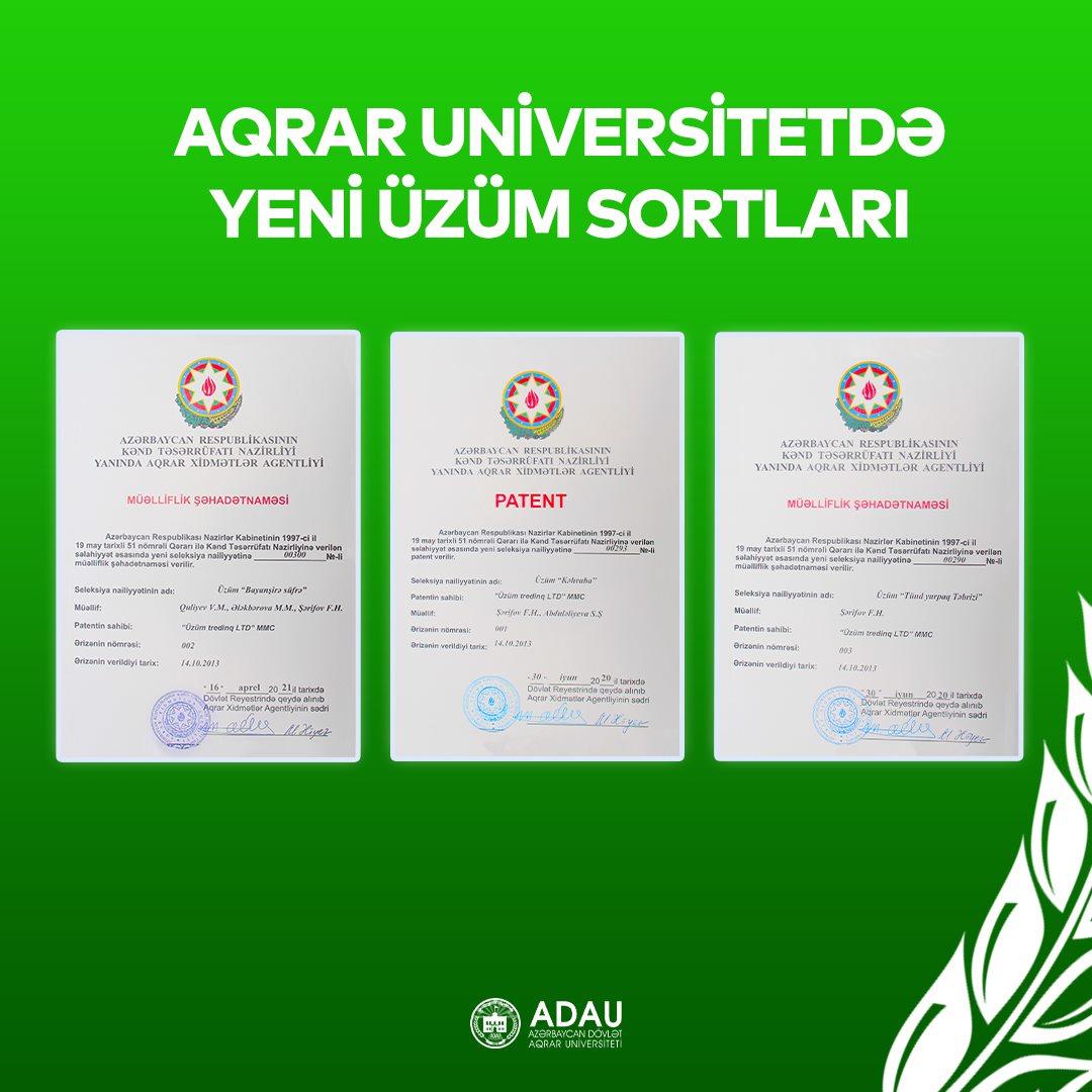 Azərbaycan Dövlət Aqrar Universitetində (ADAU) üç yeni üzüm sortu “Bayanşirə süfrə”, “Kəhraba” və “Tünd yarpaq təbrizi” rayonlaşdırılaraq dövlət reyestrində qeydiyyata alınıb.
