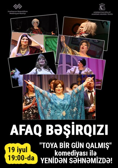 Uzun fasilədən sonra, 19 iyul saat 19:00-da Azərbaycan Dövlət Akademik Musiqili Teatrında milyonların sevimli gülüş ustası, Xalq artisti Afaq Bəşirqızının iştirakı ilə görkəmli yazıçı-dramaturq Əli Səmədlinin “Toya bir gün qalmış” komediyası nümayiş olunacaq.