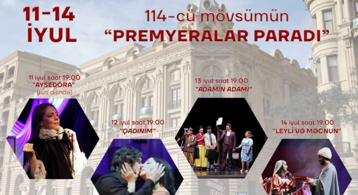 Xəbərdə qeyd edilir ki, “iyul ayının 11-də “Aysedora”, 12-də “Qadınım”, 13-də “Adamın adamı”, 14-də isə “Leyli və Məcnun” tamaşaları oynanılacaq. Xatırladaq ki, “Aysedora” mono tamaşası məşhur rus yazıçı-dramaturqu Zinoviy Saqalovun “Aysedoranın üç həyatı” pyesi əsasında hazırlanıb, rejissoru və bədii redaktoru Cavid İmamverdiyevdir. “Adamın adamı” satirası Xalq yazıçısı Anarın eyniadlı pyesi və Xalq artisti Vasif Adıgözəlovun musiqisi əsasında ərsəyə gəlib, quruluşçu rejissoru Əməkdar incəsənət xadimi Əsgər Əsgərovdur. “Qadınım” lirik-psixoloji melodramı tanınmış yazıçı-dramaturq Tuncər Cücənoğlunun “Matroşka” pyesi əsasında, rejissor, Prezident mükafatçısı İradə Gözəlovanın quruluşundadır. “Leyli və Məcnun” tamaşa isə dahi bəstəkar Üzeyir Hacıbəylinin “Leyli və Məcnun” muğam operası və böyük mütəfəkkir Məhəmməd Füzulinin eyniadlı poemasının motivləri əsasında, rejissor Samir Qulamovun librettosu və quruluşunda səhnələşdirilib”.