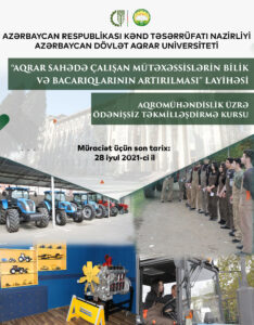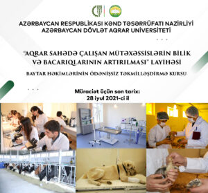 “Aqrar sahədə çalışan mütəxəssislərin bilik və bacarıqlarının artırılması” layihəsi çərçivəsində Azərbaycan Dövlət Aqrar Univeritetində(ADAU) baytarlıqvə aqromühəndislik istiqamətləri üzrə ödənişsiz təkmilləşdirmə kurslarına qeydiyyat başlanıb.