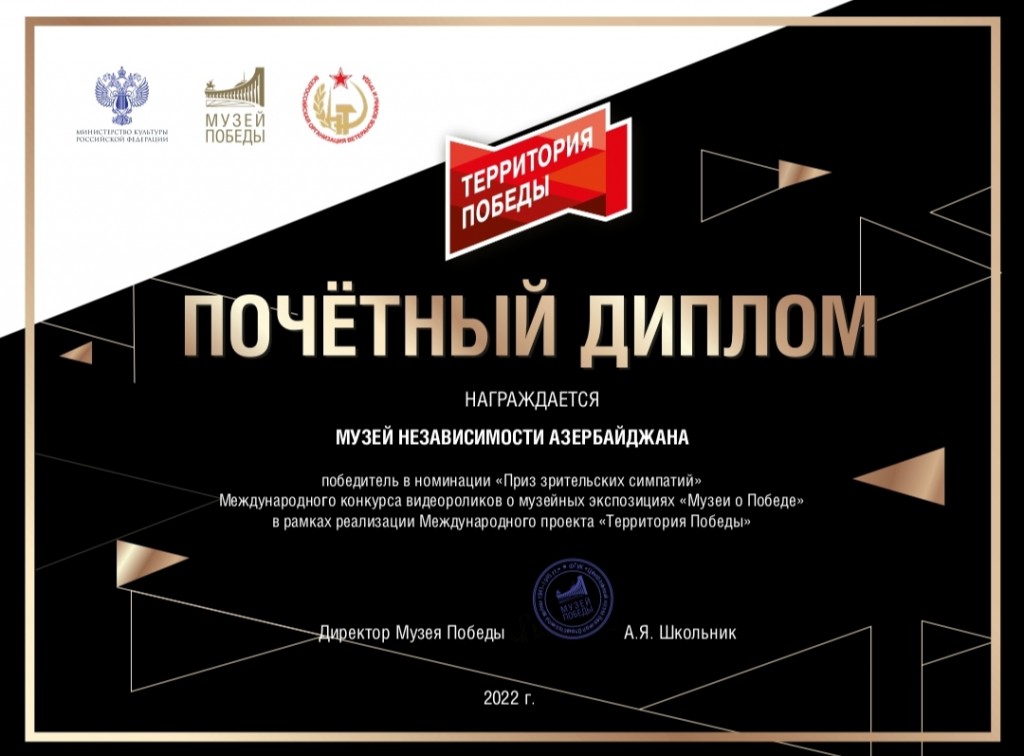 Rusiya Federasiyasının Qələbə Muzeyi tərəfindən “Muzeylər Qələbə haqqında” adlı beynəlxalq video müsabiqəsi keçirilmişdir. Qələbə Muzeyinə Azərbaycan, Rusiya, Belarus, Qazaxıstan və Moldovanın 120-dən çox muzeyindən XX əsrin ortalarının hərb tarixinə dair muzey ekspozisiyalarından bəhs olunan 130-dan çox  videoçarx təqdim olunmuşdur. Azərbaycan İstiqlal Muzeyi Azərbaycan xalqının mədəni-tarixi həyatındakı mühüm hadisələri və istiqlalı uğrunda apardığı mübarizəni özündə əks etdirən eksponatların təqdim olunduğu videoçarxla bu müsabiqədə iştirak etmişdir.