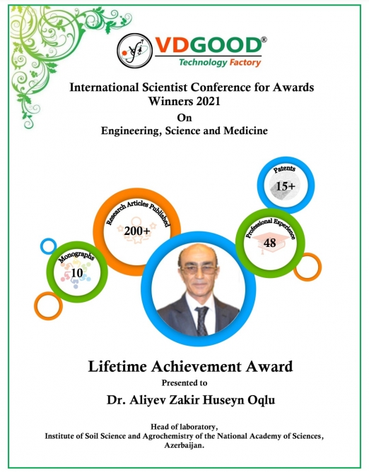 Azərbaycan Milli Elmlər Akademiyasının Torpaqşünaslıq və Aqrokimya İnstitutunun Torpaq eroziyası laboratoriyasının rəhbəri Zakir Əliyev Hindistanda “VDGOOD” Peşəkar Assosiasiyası tərəfindən nüfuzlu “Mühəndislik, Elm və Tibb üzrə Beynəlxalq Alim Mükafatları” nominasiyası üzrə beynəlxalq alim mükafatına və sertifikata layiq görülüb.