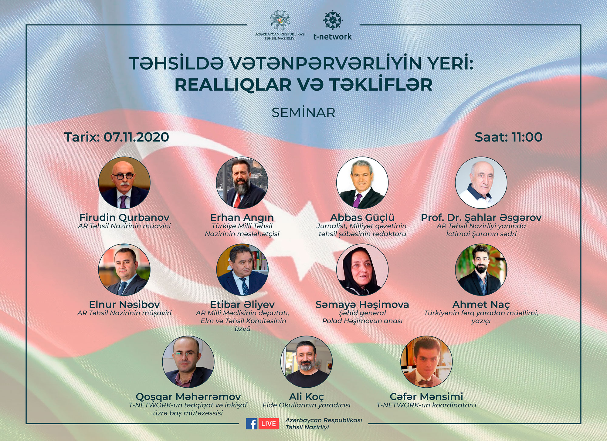 Azərbaycan Respublikasının Dövlət Bayraq Gününə həsr olunan tədbirdə Təhsil nazirinin müavini Firudin Qurbanov, Təhsil nazirinin müşaviri Elnur Nəsibov, Türkiyə Cümhuriyyəti Milli Təhsil nazirinin məsləhətçisi Erhan Angın,  Milli Məclisin Elm və Təhsil Komitəsinin üzvü, deputat Etibar Əliyev, şəhid general Polad Həşimovun anası Səmayə Həşimova, Təhsil Nazirliyi yanında İctimai Şuranın sədri Şahlar Əsgərov, “Milliyet” qəzetinin təhsil şöbəsinin redaktoru Abbas Güçlü, Fide Okullarının yaradıcısı Ali Koç, qabaqcıl müəllim və yazıçı Ahmet Naç, Xocalı rayon Yaloba kənd orta məktəbinin 9-cu sinif şagirdi Fərhad Quluzadə iştirak edib. Seminarın moderatoru  T-NETWORK-un koordinatoru Cəfər Mənsimi və eyni adlı platformanın tədqiqat və inkişaf üzrə baş mütəxəssisi, təhsil eksperti Qoşqar Məhərrəmovdur.