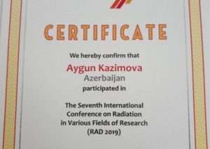 Radiyasiyanın müasir problemlərinə həsr edilmiş bu konfransda gənc tədqiqatçı “Kalium, Manqan, Tellur (Selen) kristalının elektron strukturunun tədqiqi və qamma-radiyasiyanın epitaksal filmlərinin optik xüsusiyyətlərinə təsirləri” adlı mövzu üzrə çıxış edib. Təqdim etdiyi mövzu üzzrə elmi işini davam etdirən Aygün Kazımova uğurlu çıxışına görə konfransın sertifikatı ilə təltif olunub.