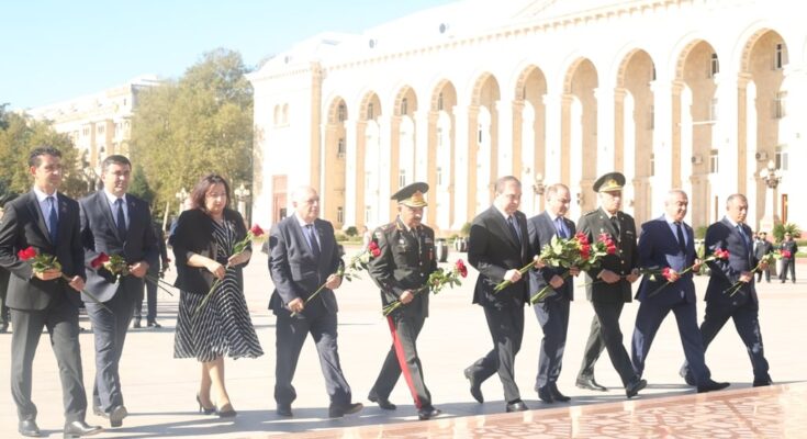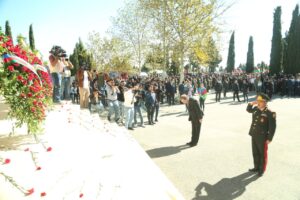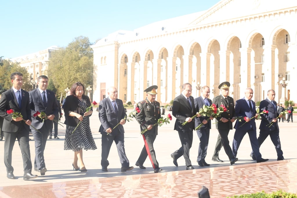 Azərbaycanın suverenliyi uğrunda canlarından keçən şəhidlərin əziz xatirəsi 1 dəqiqəlik sükutla yad edilib. Avtomobillər, yanğınsöndürən maşınlar vasitəsi ilə saat 12:00-da səs siqnalları verilib. Daha sonra rəsmilər Vətən müharibəsi zamanı Ermənistan silahlı qüvvələrinin Gəncəni raket atəşinə tutması nəticəsində dağılan əraziləri ziyarət edib, burada həlak olan mülki şəhidlərin şəkil və məlumatlarını əks etdirən lövhəyə baxış keçiriblər. Rəsmilər onların xatirəsinə ehtiram əlaməti olaraq gül dəstələri düzüblər.