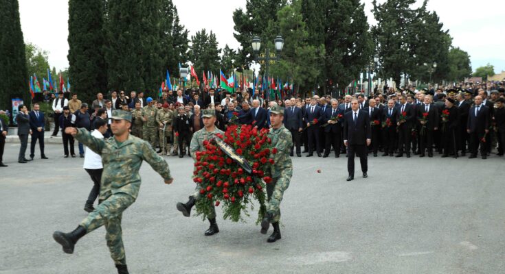 Daha sonra Şəhidlər xiyabanında Azərbaycanın müstəqilliyi, suverenliyi və ərazi bütövlüyü uğrunda canından keçən şəhidlərimizin əziz xatirəsi bir dəqiqəlik sükutla yad edilib. Şəhərin Nizami Gəncəvi və Heydər Əliyev, Heydər Əliyev və Şah İsmayıl Xətai prospektlərinin kəsişməsində nəqliyyatın hərəkəti dayandırılıb, avtomobillər vasitəsilə səs siqnalları verilib.