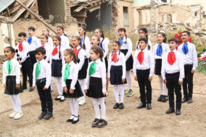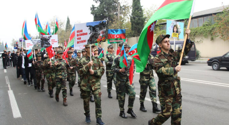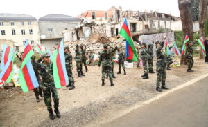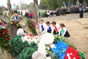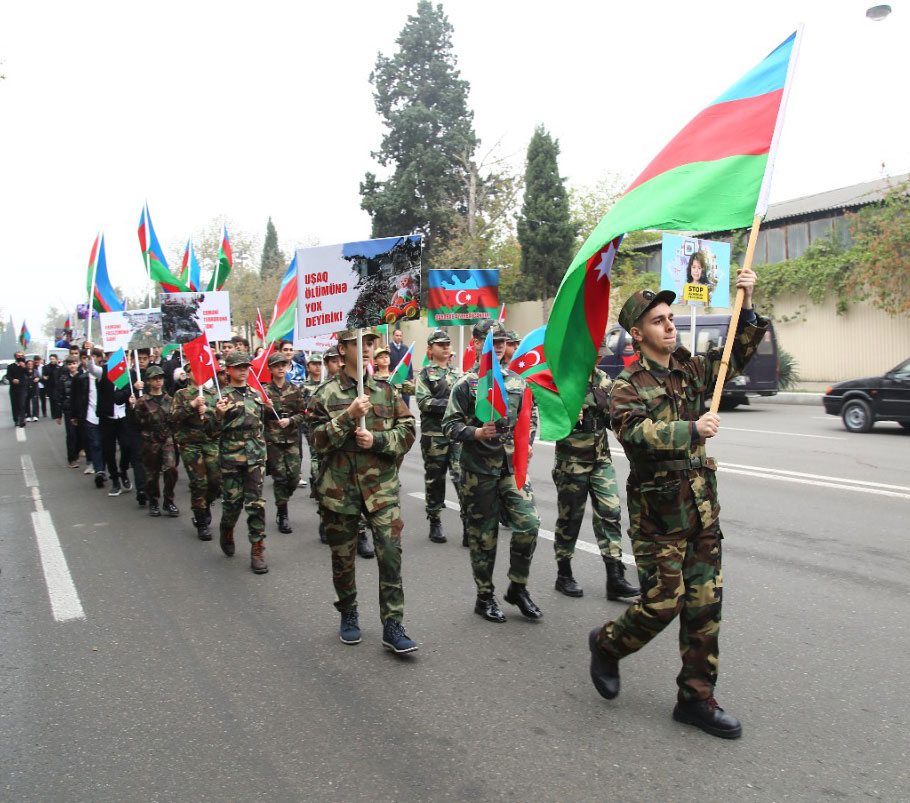 Daha sonra məktəblilər əllərində tutduqları plakat, şəkil və bayraqlarla terror törədilən məkana yürüş edib. Gəncə şəhərində amansız terror nəticəsində həlak olanların xatirəsi 1 dəqiqəlik sükutla yad edilib, hadisə yerinə gül dəstələri qoyulub.