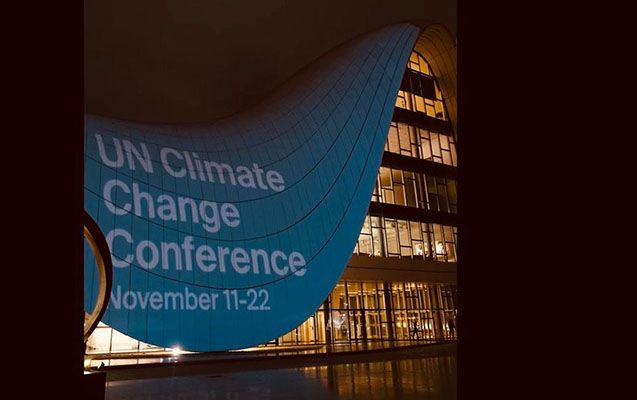 Heydər Əliyev Mərkəzinin binası COP29 loqosu ilə işıqlandırılıb.