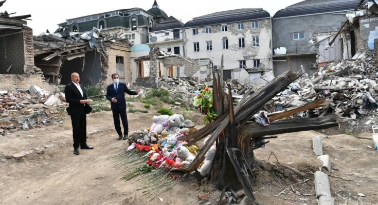 Erməni faşizminin izləri ilə tanış olan Prezident İlham Əliyev həlak olan dinc sakinlərin xatirəsinə ehtiram əlaməti olaraq, tamamilə dağılmış yaşayış binalarının ətrafına gül düzüb.