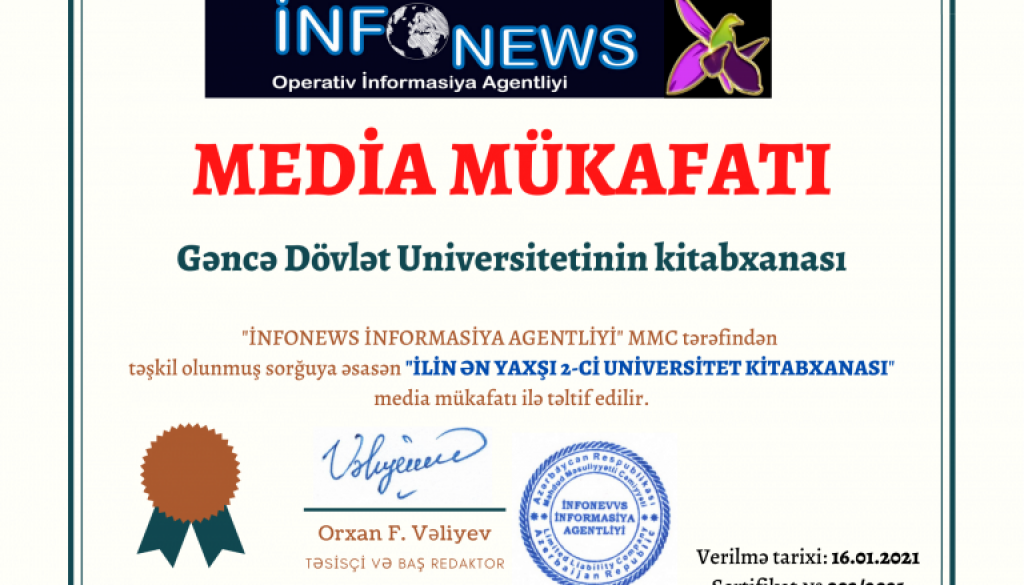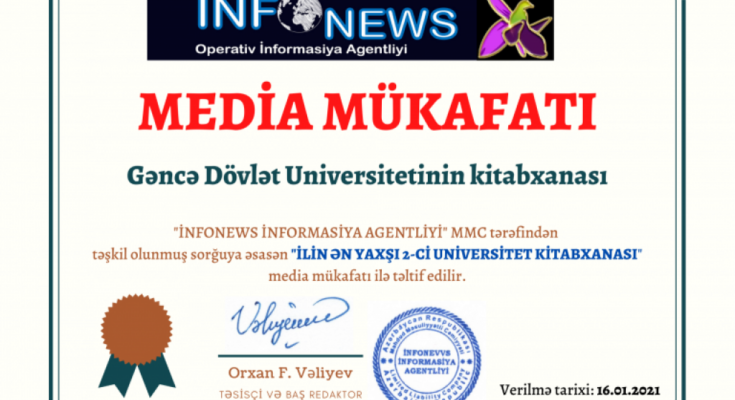 “İNFONEWS İNFORMASİYA AGENTLİYİ” MMC-in təsis etdiyi “İlin ən yaxşı universitet kitabxanası” media mükafatı üzrə səsvermənin yekun nəticələri müəyyən olub.