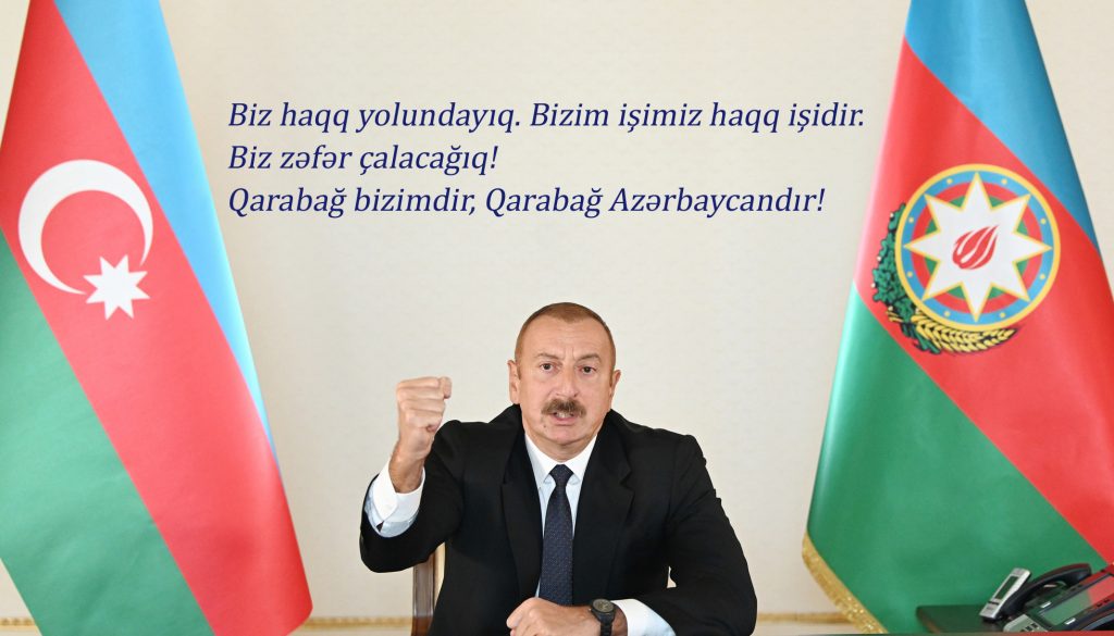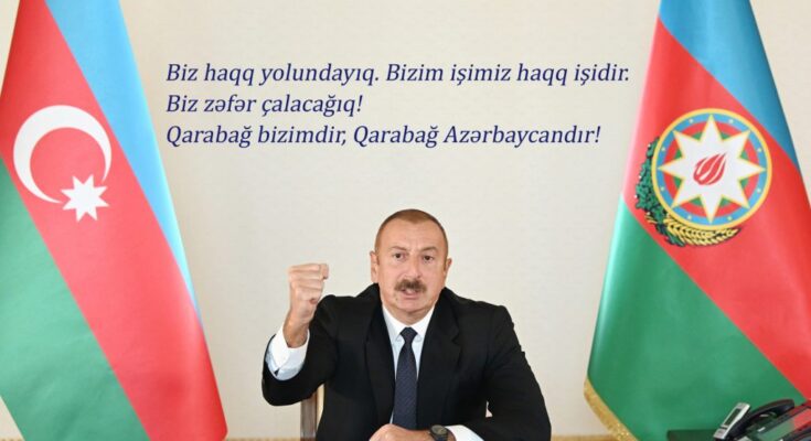 Bu günlərdə ön cəbhədə ağır döyüşlər gedir. Azərbaycan Ordusu öz torpağında Azərbaycanın ərazi bütövlüyünü qoruyur, müdafiə edir. Cənab prezidentimiz dediyi kimi tarixi ədalət bizim tərəfimizdədir. Çünki bu, bizim doğma, dədə-baba torpağımızdır. Beynəlxalq hüquq bizim tərəfimizdədir. Bütün beynəlxalq təşkilatlar Azərbaycanın ərazi bütövlüyünü tanıyır. Bütün ölkələr Azərbaycanın ərazi bütövlüyünü tanıyır. Beynəlxalq təşkilatlar çərçivəsində qəbul edilmiş qərar və qətnamələr Dağlıq Qarabağın Azərbaycana məxsus olduğunu açıq-aydın təsbit edir. BMT Təhlükəsizlik Şurasının dörd qətnaməsində deyilir ki, erməni silahlı qüvvələri dərhal, tam və qeyd-şərtsiz işğal edilmiş torpaqlardan çıxarılmalıdır. Otuz ilə yaxındır ki, bu qətnamələr kağız üzərində qalır. Ancaq biz öz qeyrətli ordumuza güvənirik. İnanırıq ki, qısa müddətdə 30 illik həsrətimizə son qoyacaqlar. İrəli Azərbaycan Əsgəri! Tanrı sizi qorusun!