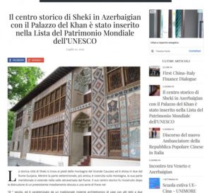 İtaliya mətbuatında Şəki Xan Sarayı və Şəkinin tarixi mərkəzinin UNESKO-nun siyahısına daxil edilməsi ilə bağlı məqalə dərc edilib.