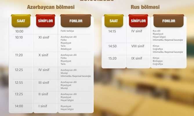 Xatırladaq ki, martın 11-dən başlayaraq Təhsil Nazirliyinin təşkilatçılığı ilə “Mədəniyyət” və “ARB Günəş” telekanallarında “Dərs vaxtı” proqramının yayımına start verilib. Proqram çərçivəsində həftənin 5 günü teledərslər keçirilir. Teledərslər bütün sinifləri əhatə edir, dərs mövzularına dair qısa izah və təlimatlar təqdim olunur.