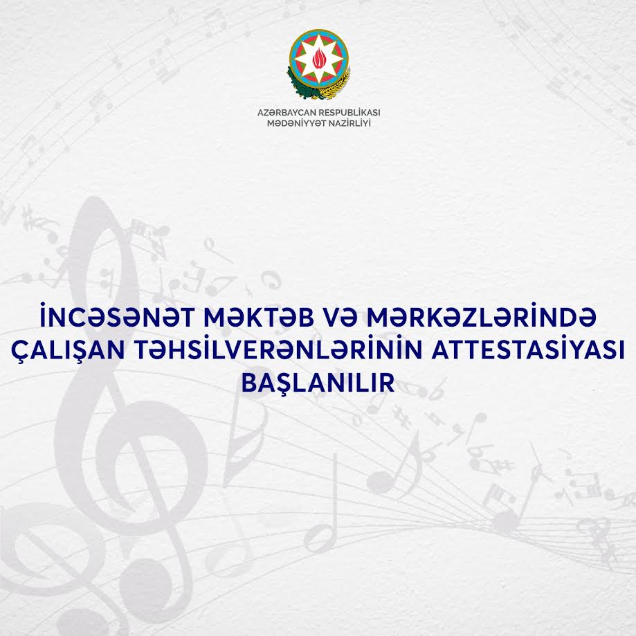 Mədəniyyət Nazirliyinin musiqi və incəsənət sahəsinə aid islahatları çərçivəsində təhsilin keyfiyyətinin, eləcə də nazirliyin tabeliyindəki musiqi, incəsənət məktəb və mərkəzlərində çalışan təhsilverənlərin peşə səriştə və bacarıqlarının ölçülməsi, ixtisasına, sənətinə müvafiq olaraq onların tutduğu vəzifəyə uyğunluğunun müəyyənləşdirilməsi məqsədilə 2026-cı ilin fevral ayının 10-dan başlayaraq attestasiyanın keçirilməsi nəzərdə tutulur.