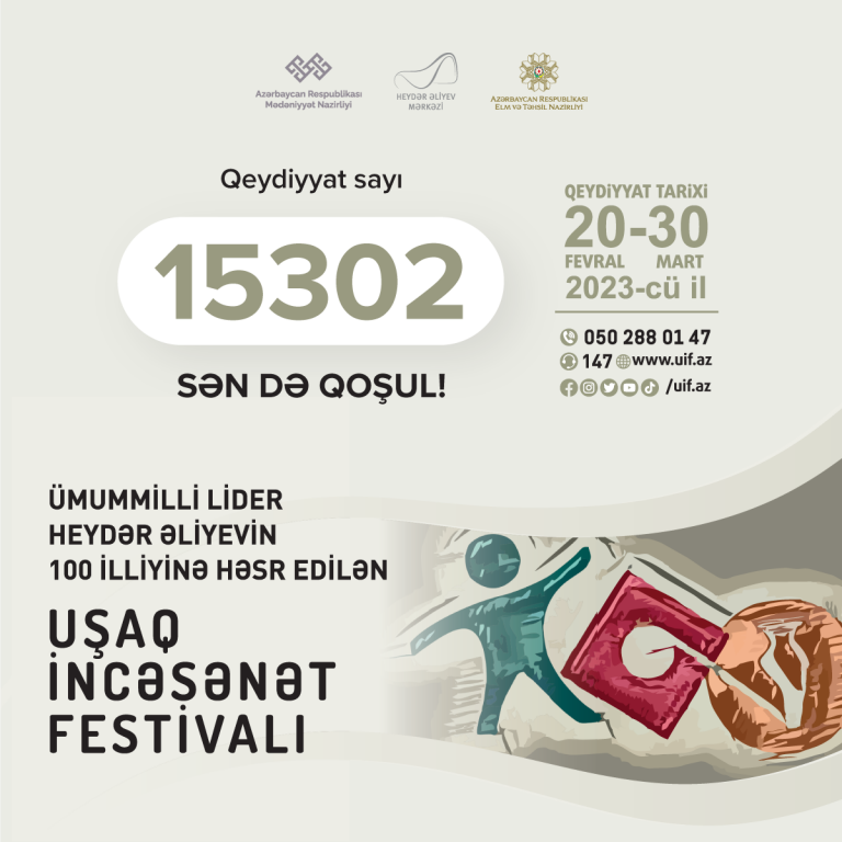 Azərbaycan xalqının Ümummilli lideri Heydər Əliyevin 100 illik yubileyi münasibətilə Mədəniyyət Nazirliyi, Elm və Təhsil Nazirliyi və Heydər Əliyev Mərkəzinin birgə təşkil etdiyi Uşaq İncəsənət Festivalına qeydiyyat davam edir.