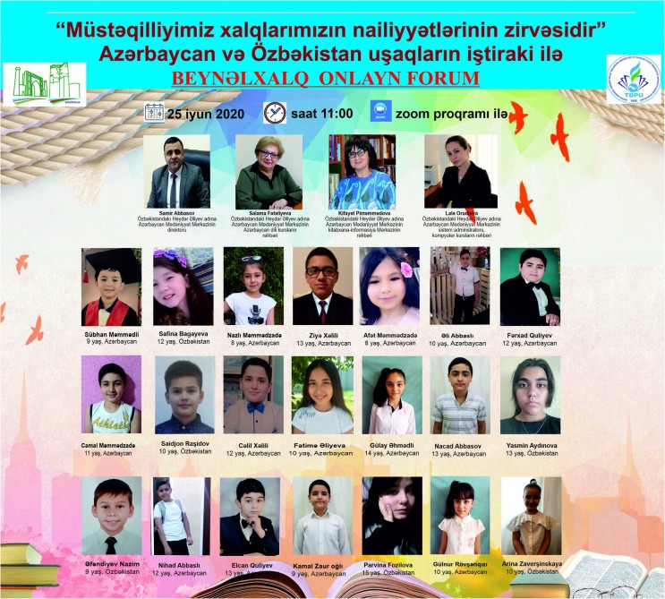 İyunun 25-də Özbəkistandakı Heydər Əliyev adına Azərbaycan Mədəniyyət Mərkəzinin (AMM) təşkilatçılığı, Azərbaycan və Özbəkistan uşaqlarının iştirakı ilə “Müstəqilliyimiz xalqlarımızın uğurlarının zirvəsi” adlı beynəlxalq onlayn forum keçiriləcək.