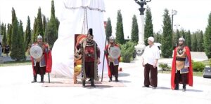 Tədbir iştirakçıları Nizami Gəncəvi Muzeyinin önünə gəldilər.