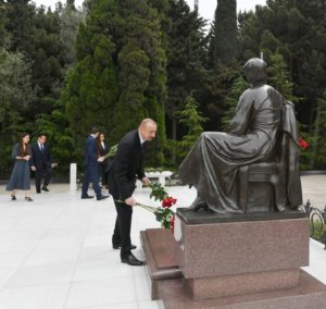 Sonra dövlətimizin başçısı və ailə üzvləri Ulu Öndərin ömür-gün yoldaşı, görkəmli oftalmoloq-alim, akademik Zərifə xanım Əliyevanın xatirəsini ehtiramla anaraq məzarı üzərinə gül dəstələri qoydular.