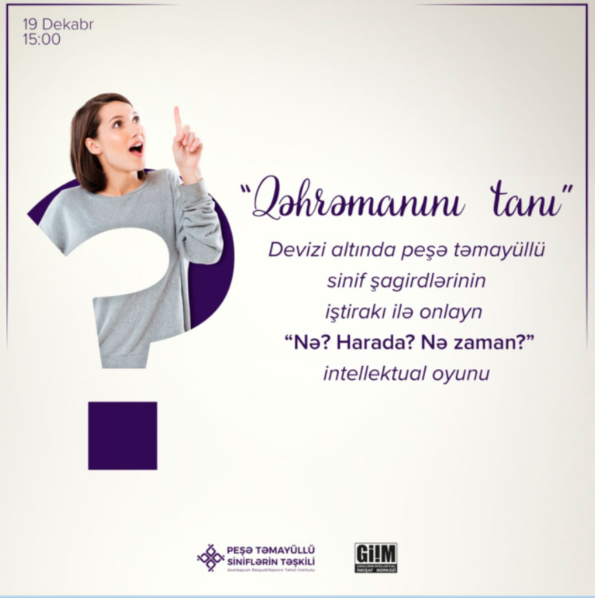 Təhsil Nazirliyinin “Peşə təmayüllü siniflərin təşkili” layihəsi çərçivəsində “Qəhrəmanını tanı” devizi altında onlayn şəkildə “Nə? Harada? Nə zaman?” intellektual oyunu keçirilib.