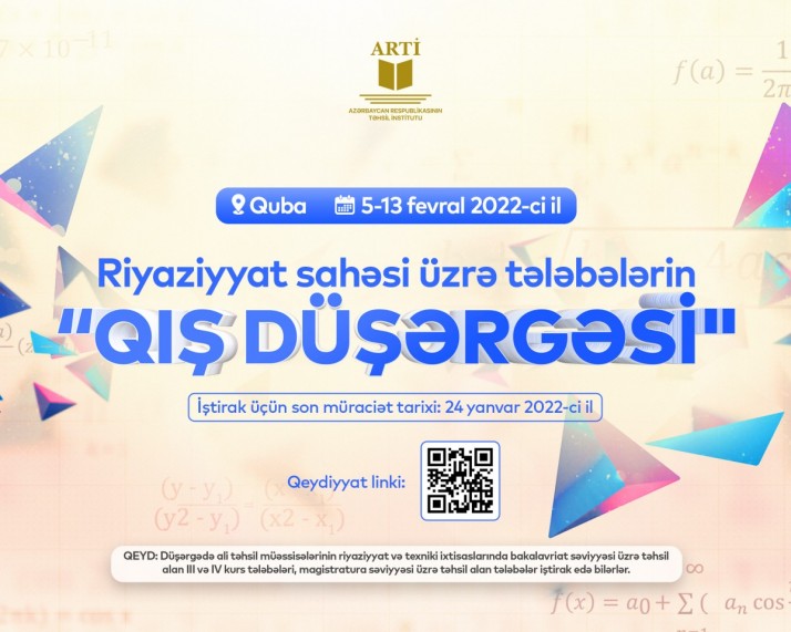 Düşərgədə iştirak etmək istəyən tələbələr 24 yanvar 2022-ci il tarixinədək https://anket.edu.az/link/174 linki vasitəsilə qeydiyyatdan keçməli və ali riyaziyyat üzrə baza biliklərin (“Riyazi analiz”, “Cəbr və ədədlər nəzəriyyəsi” fənləri üzrə) yoxlanılması məqsədilə təşkil olunacaq test imtahanında uğur qazanmalıdırlar.
