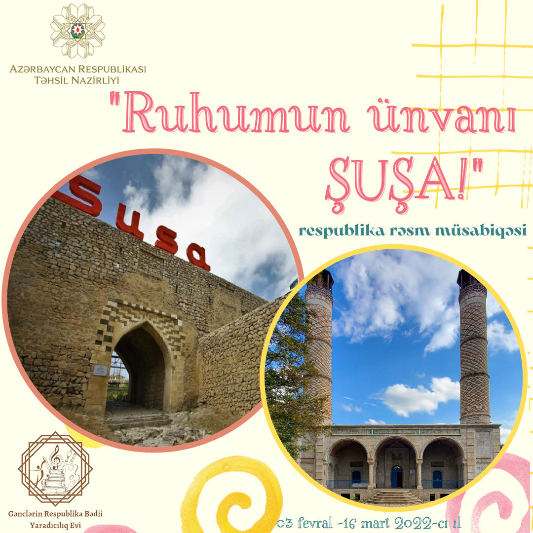 “Ruhumun ünvanı Şuşa!” adlı respublika rəsm müsabiqəsinə müraciətlərin qəbulu davam edir. Təhsil Nazirliyinin dəstəyi, Gənclərin Respublika Bədii Yaradıcılıq Evinin təşkilatçılığı ilə keçirilən müsabiqəyə Təhsil Nazirliyinin sistemində fəaliyyət göstərən ümumtəhsil məktəblərinin şagirdləri və uşaq-gənclər inkişaf mərkəzlərinin dərnək üzvləri qatıla bilərlər”.