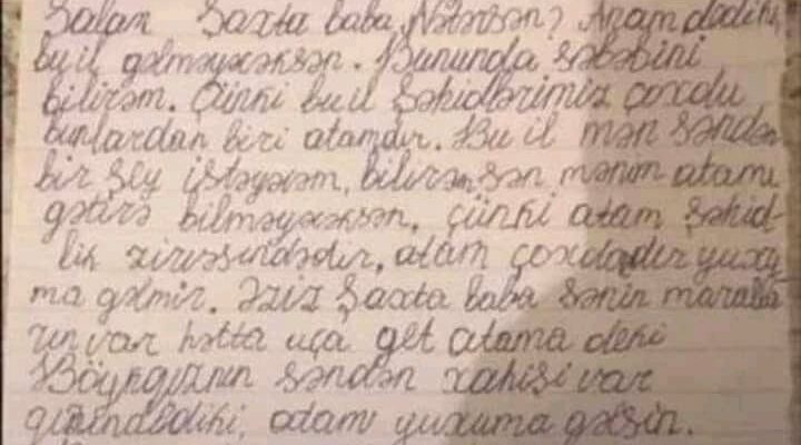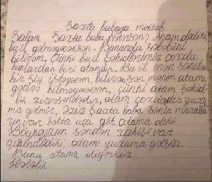 Salam, şaxta baba. nətərsən? Anam dedi ki, bu il gəlməyəcən. Bunun da səbəbini bilirəm. Çünki bu il şəhidlərimiz çoxdu. Bunlardan biri də mənim atamdır. Bu il səndən bir şey istəyəcəm. Bilirəm atamı qaytara bilməyəcəksən. Çünki atam şəhidlik zirvəsinə ucalıb. Atam çoxdandır yuxuma gəlmir. Əziz şaxta baba sənin maralların var, hətta uça bilirlər. Atama de ki, böyük qızının səndən xahişi var. Qızın dedi ki, atam yuxuma gəlsin. Bunu atama deyərsiz. Hələlik.
