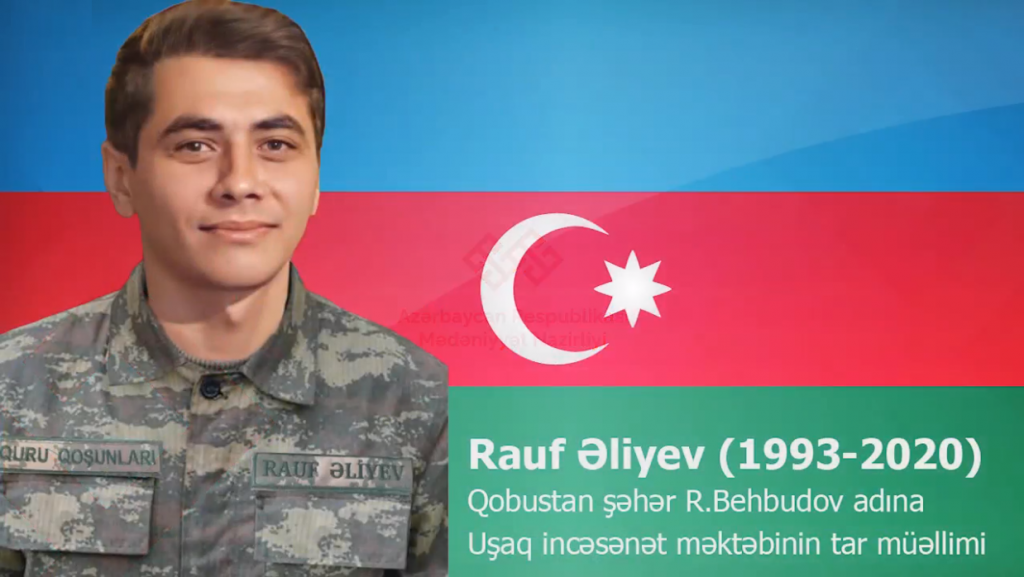 27 sentyabr 2020-ci ildə başlanan Vətən müharibəsinə könüllü yollananlar sırasında, sinəsinə sıxdığı doğma tarını anasına əmanət edib, yurdunun torpağına qarışan şəhidimiz Rauf Əliyev də var.