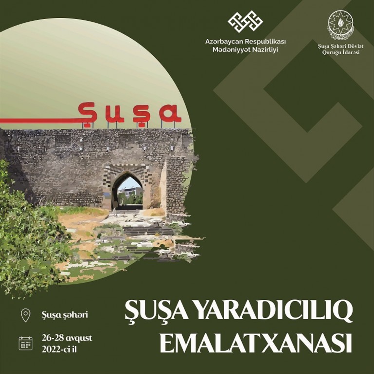 Mədəniyyət Nazirliyinin təşkilatçılığı, Şuşa Şəhəri Dövlət Qoruğu İdarəsinin dəstəyi ilə 26-28 avqust tarixində Mədəniyyət paytaxtımız Şuşa şəhərində yaradıcı insanların iştirakı ilə “Şuşa yaradıcılıq emalatxanası” adlı layihəsi həyata keçiriləcək.