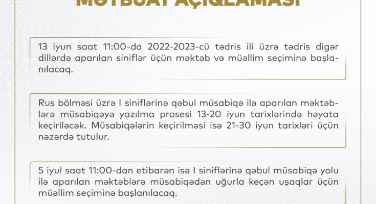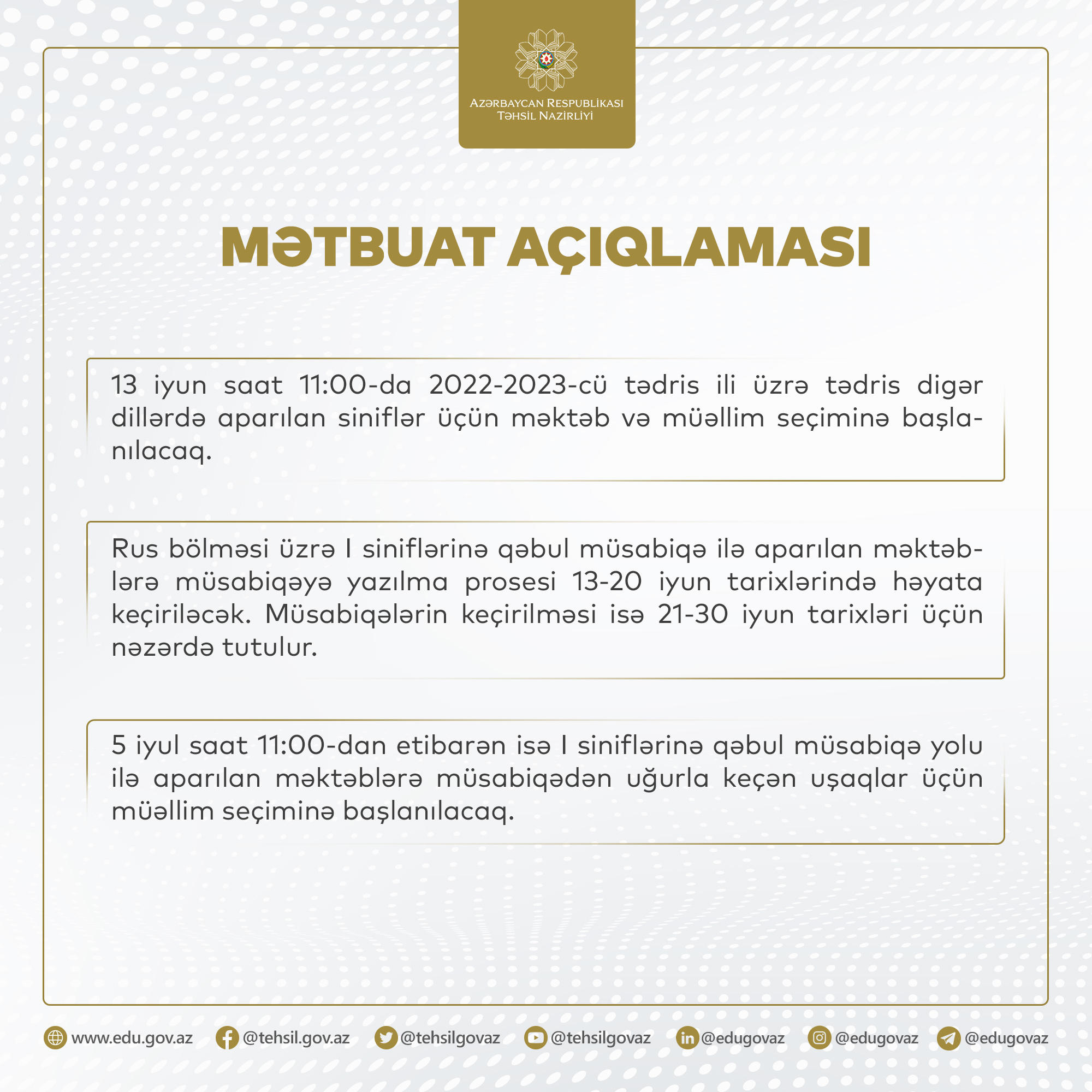 Həmin tarixdən rus bölməsi üzrə I siniflərinə qəbul müsabiqə yolu ilə aparılan ümumi təhsil müəssisələrinə qəbulla bağlı prioritetlər üzrə məktəb seçimi və prioritetlər üzrə üstünlüyə malik olmayanlar üçün müsabiqəyə yazılma (Bakı Avropa liseyi, Respublika İncəsənət gimnaziyası, Bülbül adına orta ixtisas musiqi məktəbi də daxil olmaqla) prosesinə də başlanılacaq.