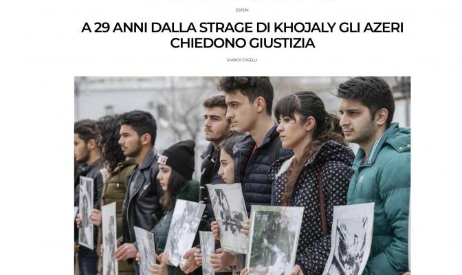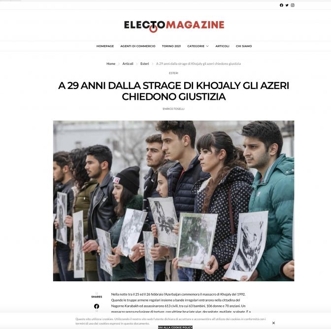 İtaliyanın “ElectoMagazine” onlayn qəzetində Enriko Tosellinin müəllifliyi ilə “Xocalı qırğınından 29 il sonra, azərbaycanlılar ədalət istəyir” başlıqlı Xocalı soyqırımından bəhs edən məqalə dərc edilib.