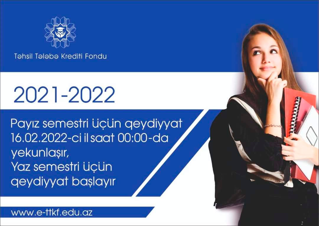 Fevralın 16-dan 2021-2022-ci tədris ilinin yaz semestri üzrə təhsil tələbə krediti almaq üçün müraciətlərin qəbuluna başlanılıb.