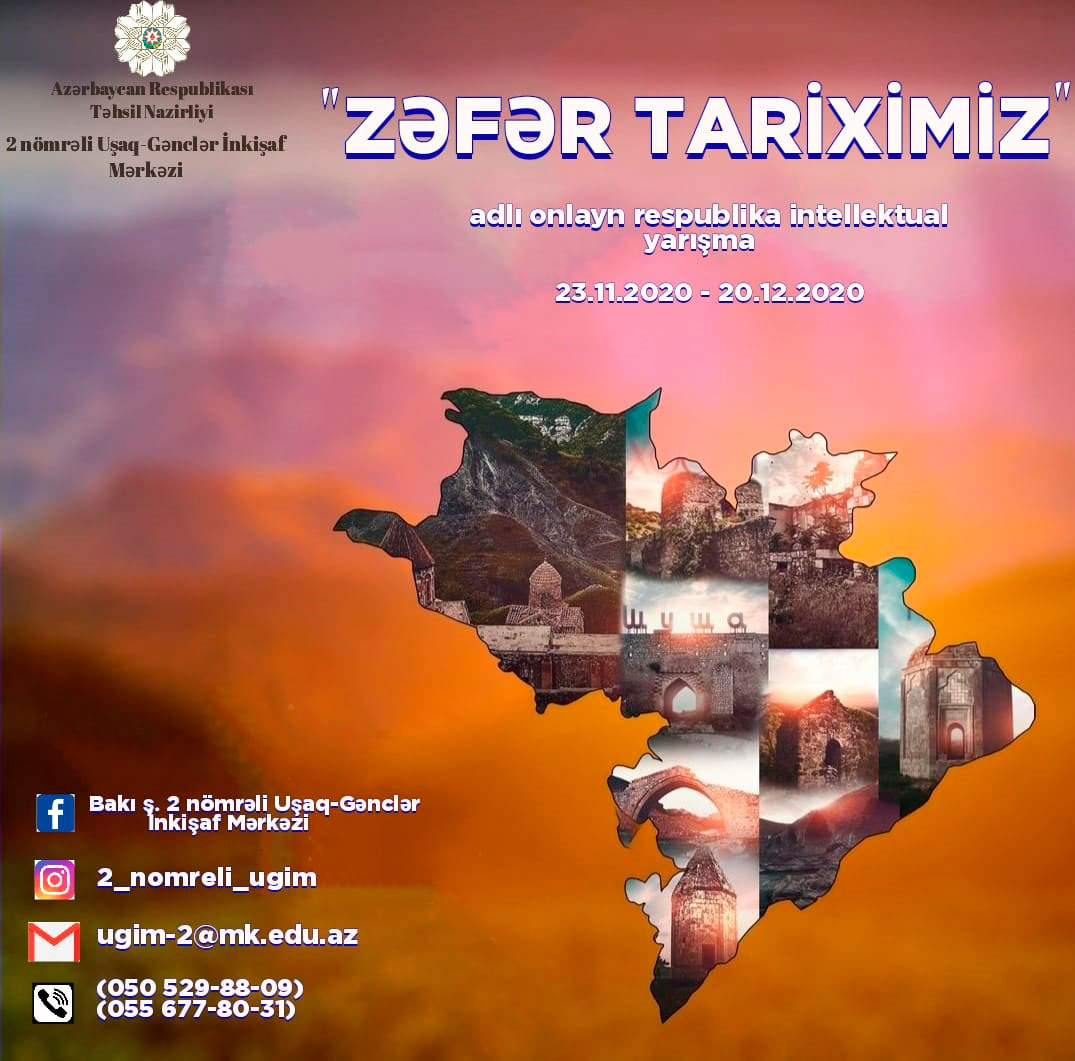 Təhsil Nazirliyinin dəstəyi və 2 nömrəli Uşaq-Gənclər İnkişaf Mərkəzinin təşkilatçılığı ilə 23 noyabr – 20 dekabr tarixlərini əhatə edən “Zəfər tariximiz” adlı onlayn respublika intellektual yarışmasına start verilib.