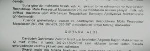 “Sonra evə gəlib görürəm ki, məhkəmədən məktub gəlib. 15 apreldə mənim şikayət ərizəmə baxılıb və avtomobilin üzərindən həbsin görütülməsi iddiam təmin edilməyib. 15 apreldə verilmiş qərar mənə 24-ü çatır. Xırdalandan Mehdiabada bu vaxt ərzində piyada gətirsəydilər, məktub daha tez çatardı”.
